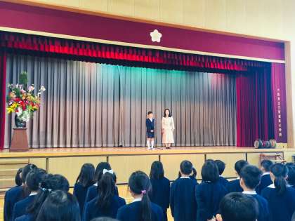 校長先生から、 転入生の紹介がありました。転入生は、全校児童の前でしっかりとあいさつをすることができました。