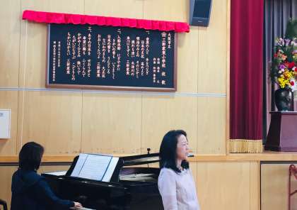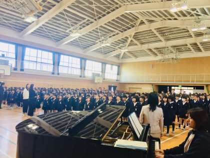 始業式の始めに大阪市歌を斉唱し、終わりには校歌を斉唱しました。