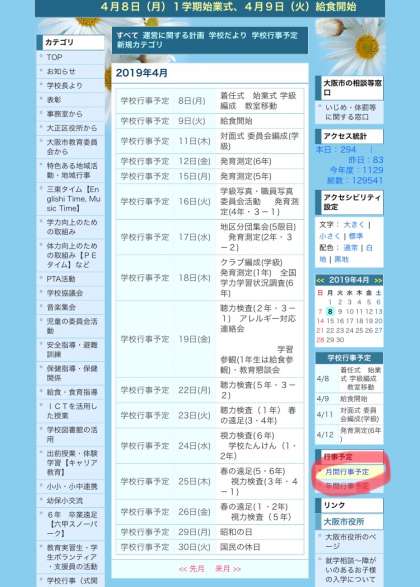 学校ホームページの右欄「行事予定」をクリックしていただくと、月間行事予定をご覧いただけます。