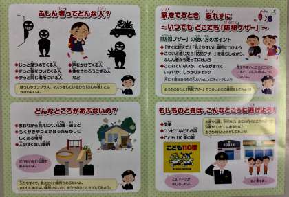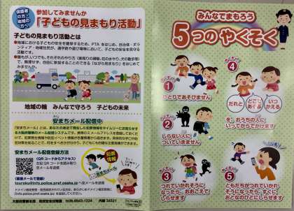 今日の児童の登校時には、大正警察署の見守りサポーターの方にも見守りをしていただきました。こちらのリーフレット「5つのやくそく」は、1年生には後日配布します。