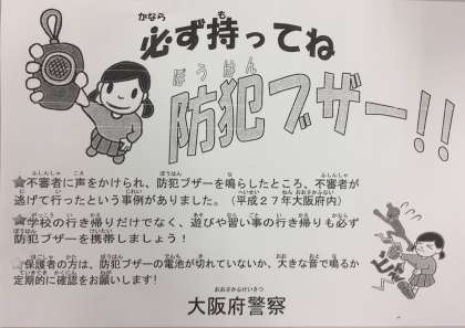 大阪府警察からの連絡です。保護者の方は、防犯ブザーの電池が切れていないか、大きな音で鳴るか確認をお願いします。
