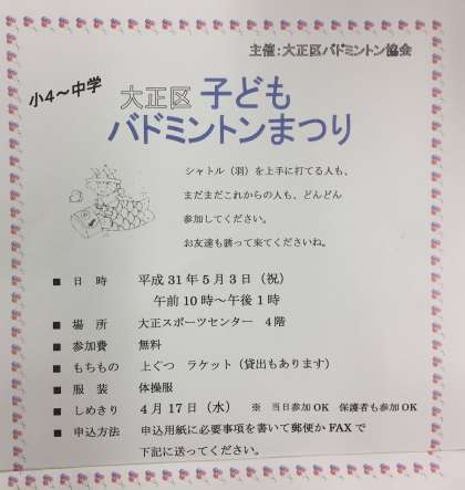 参加される方は、以前に配布しています申し込み書を4月17日(水)までに、郵送又はFAXで「大正区バドミントン協会」に提出してください。