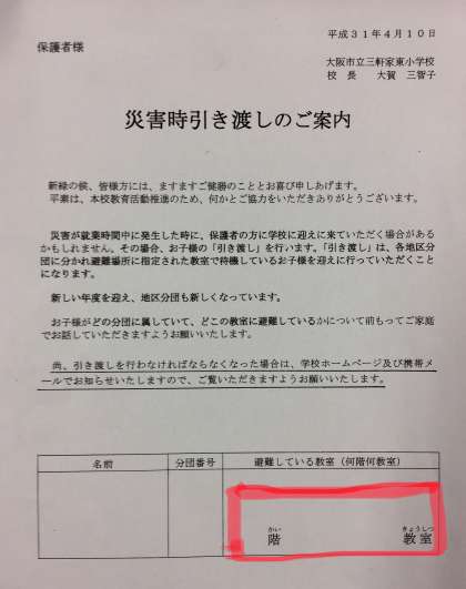 本日、「災害時引き渡しのご案内」を配布しています。お子さまの「分団番号」と「避難している教室(3階以上)」をご確認ください。学校ホームページ右欄下に「地区分団 校舎配置図」を載せています。非常災害時には、アクセスが集中し、配布文書を見ることができないことがあります。事前に、お子さまの引き渡し場所をご確認ください。
