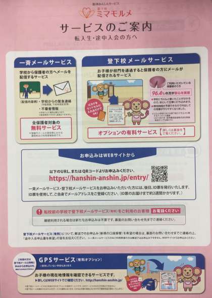 一斉メールサービス「ミマモルメ」の案内です。本校では、災害時など緊急に連絡する際にはミマモルメを活用しています。登録がまだの方や、ミマモルメのメールが受信できない方は、直接ミマモルメに連絡をしてください。