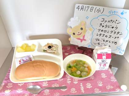 今日の給食は、コッペパン、イチゴジャム、牛乳、マカロニグラタン、レタスのスープ、りんご(缶)です。