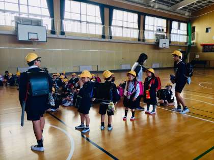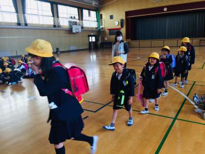地区分団集会をしました。6年生が1年生を迎えに行きました。