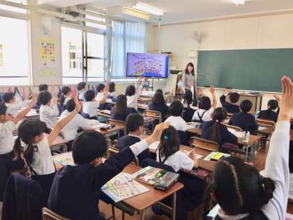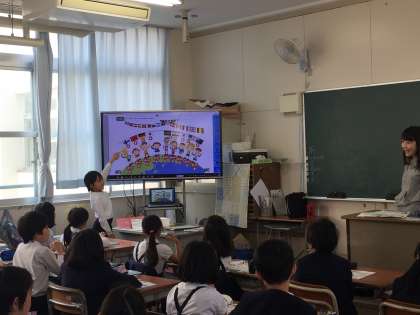 教科書を使って、英語を学習しています。今日は、色々な国のあいさつを学びました。
