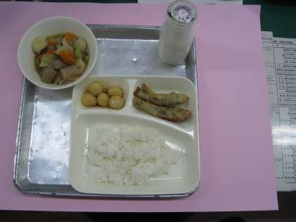 今日は月見の行事献立です。「いわしてんぷら、鶏肉とさといもの煮もの、みたらしだんご」でした。
