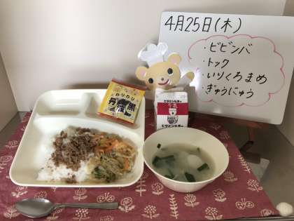 今日の給食は、ビビンバ、牛乳、トック、いり黒豆です。