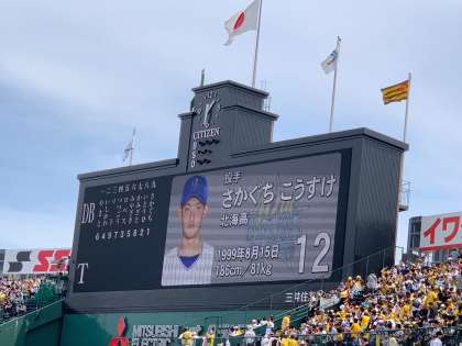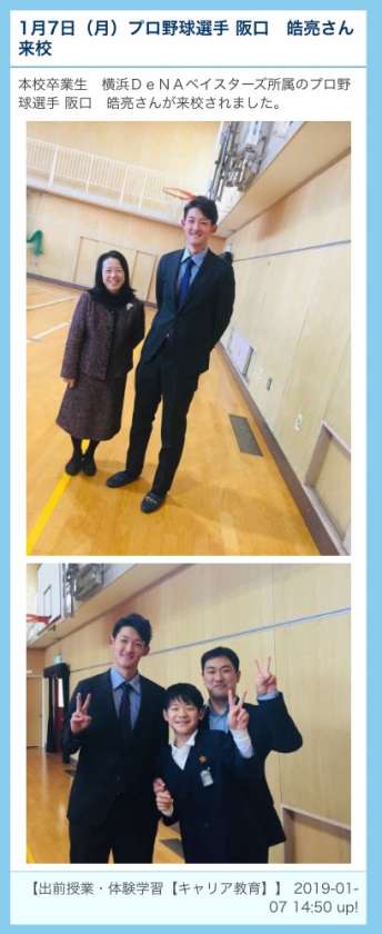 本校卒業生で、プロ野球 横浜DeNaベイスターズチーム所属の阪口皓亮(さかぐち こうすけ)投手が、5月3日に甲子園で行われた阪神戦で、プロ初登板初先発されました。5回2安打無失点でした。初球は、150キロの直球ストライクでした。