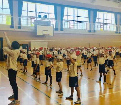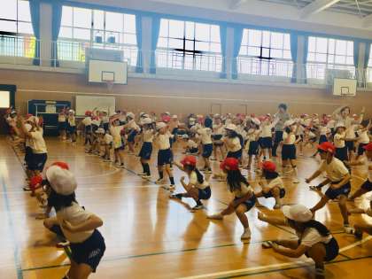 運動会の練習が始まりました。団体演技での動きを習得中です。体力向上のためにも「はやね・はやおき・あさごはん」を心がけましょう。
