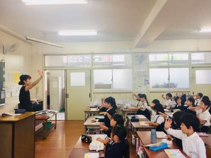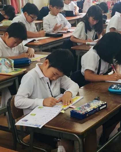 漢字学習の様子です。「とめ」「はね」「はらい」を意識できるように、鉛筆で書く前に、空書きをしています。正しい姿勢の習慣がついてきました。