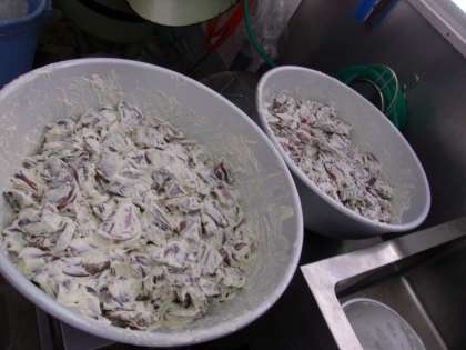 本日の「かつおのガーリック風味焼き」で使用するノンエッグドレッシングは、卵を使用していないマヨネーズ風調味料で、卵アレルギーの子ども達もマヨネーズ風味で食べることができるようにしています。