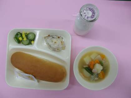 今日の献立は、「かつおのガーリック風味焼き、スープ煮、きゅうりとコーンのサラダ」です。