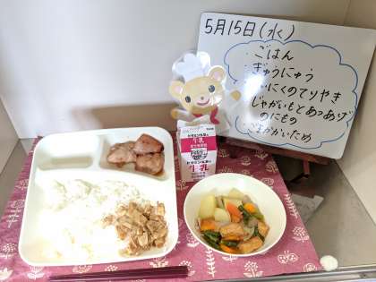 今日の給食は、ごはん、牛乳、鶏肉のてり焼き、じゃがいもとあつあげの煮物、ごまかかいためです。
