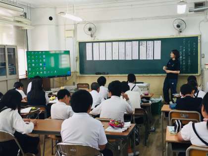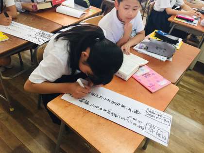 3年生以上は、国語と算数の授業では、習熟度別少人数指導を行っています。このクラスでは、今日は、家庭で国語辞書を使って調べてきたことの発表をしました。