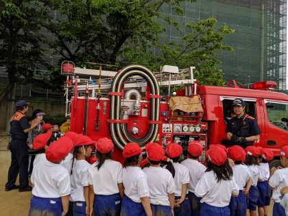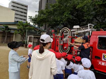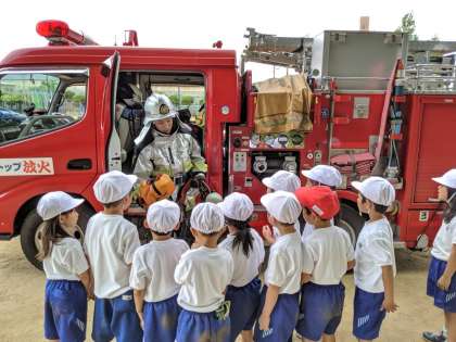 1年生は、すぐ近くで、消防車を見せていただきました。