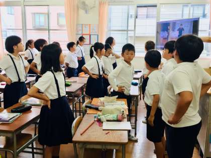 今日は運動場が使えないので、教室で姿勢体操をしました。4年2組では、体育係が模範体操をしていました。
