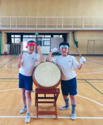 応援団で大太鼓を叩く児童です。三年連続、応援団をしています。小学校最後の運動会で、自分たちのチームが優勝できるように、しっかり応援します。