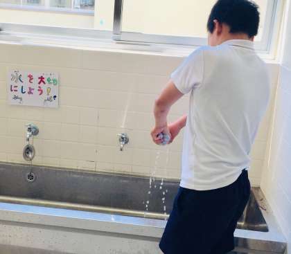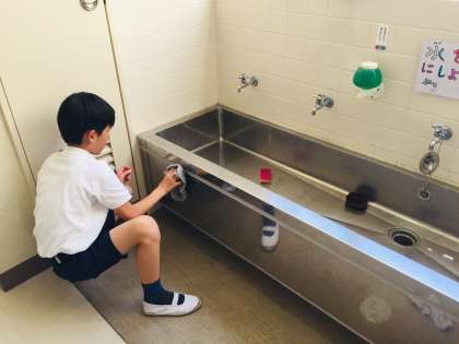 手洗い場の場所を担当している児童です。ぞうきんをしっかりとしぼって、ていねいにそうじをしていました。