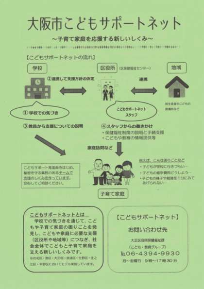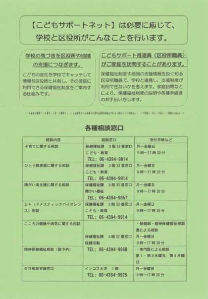 「大阪市こどもサポートネット 」のお知らせチラシです。(1年生には配布しています。)学校ホームページ右欄【大阪市こどもサポートネット】から、ご覧いただけます。