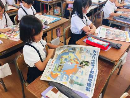こども新聞を読んでいます。G20大阪サミットの話題をしています。ご家庭でも、お子様とご一緒にぜひ読んでください。