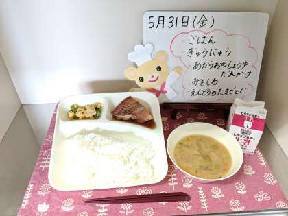 今日の給食は、ごはん、牛乳、あかうおのしょうゆだれかけ、みそ汁、えんどうの卵とじです。