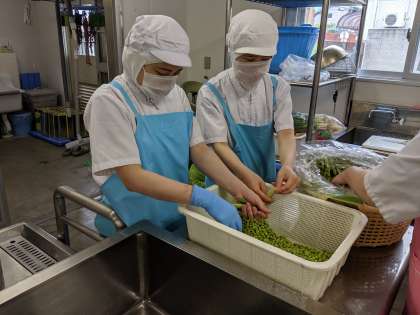 「えんどうの卵とじ」は、旬のえんどうを使用し、春を感じさせる献立です。1年に1回登場します。