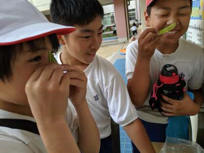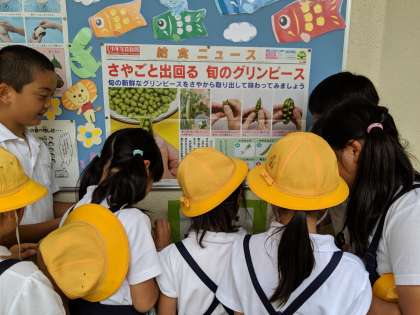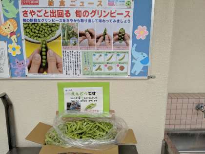 むいたあとのえんどうのさやを展示しました。手にっとって観察したり、においをかいだりと興味津々の様子でした。