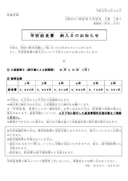 6月10日に、学校給食費(6月分)の口座振替を行います。