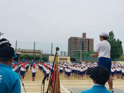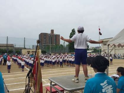 運動会の様子です。全校児童で校歌を歌っています。児童代表が、指揮をしています。