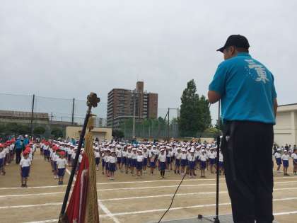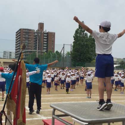 運動会の様子です。開会式での「競技上の注意」の後、ラジオ体操をしました。
