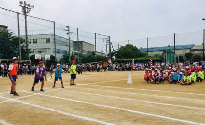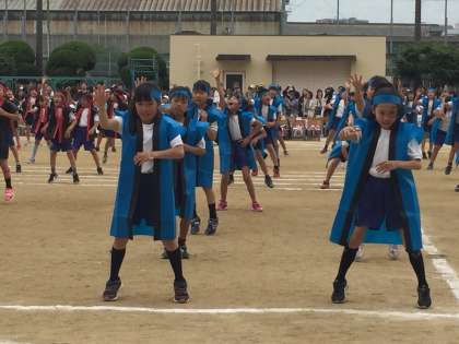 運動会の様子です。3.4年生団体演技「どっこいしょ!どっこいしょ!」の様子と3年生から6年生の「たてわりリレー」の様子です。