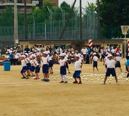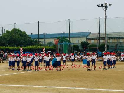 運動会の様子です。1年団体競技「どんどん玉入れ」の活動のようすです。「エビカニクス」音頭をしています。