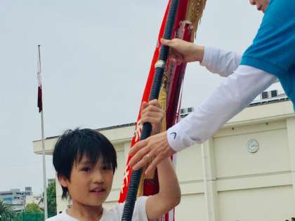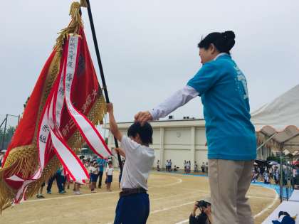 運動会の様子です。今年は、白組が優勝しました。応援団白組の団長児童が、校長先生から、優勝旗を授与されました。
