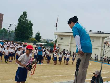 運動会の様子です。閉会式、「優勝旗授与」「準優勝旗授与」の様子です。今年は、白組が優勝しました。