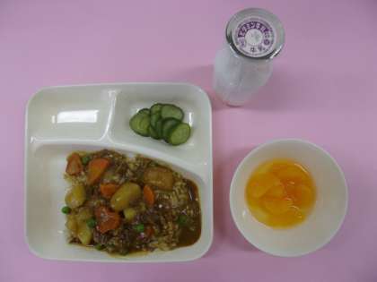 今日の献立は「ビーフカレーライス(米粉)、きゅうりのピクルス、みかん(缶詰)」でした。