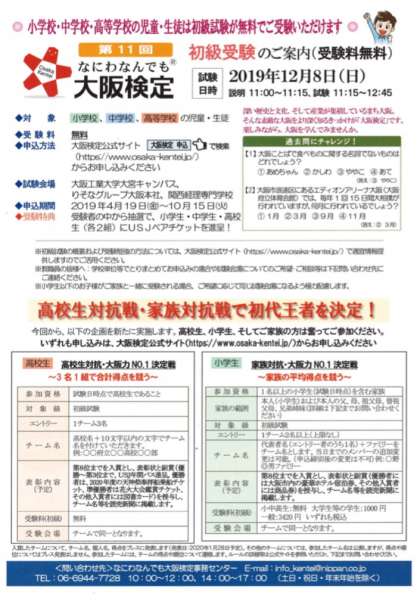 「なにわなんでも大阪検定」の案内です。学校ホームページ右欄下【ご案内】にもチラシを載せています。