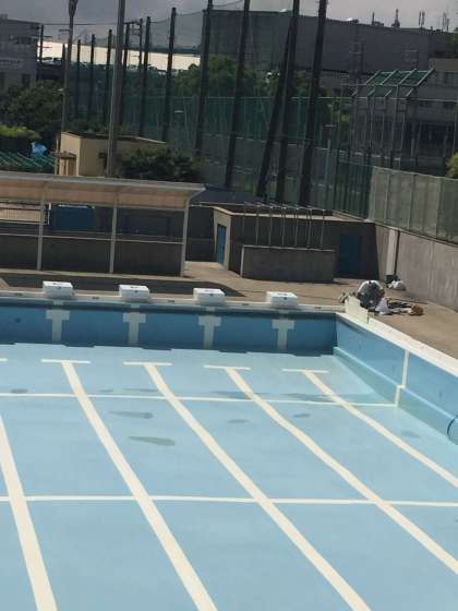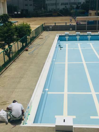 バリアフリーのために、プールの入水梯子取り付け工事を行っています。今年は6月20日(木)からプール水泳を始める予定です。