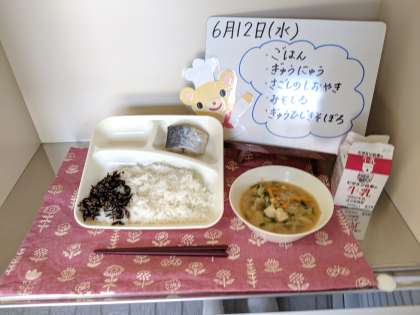 今日の給食は、ごはん、牛乳、さごしの塩焼き、みそ汁、牛ひじきそぼろです。