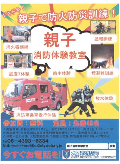 大阪市消防局のイベント「親子で防火防災訓練」の案内です。