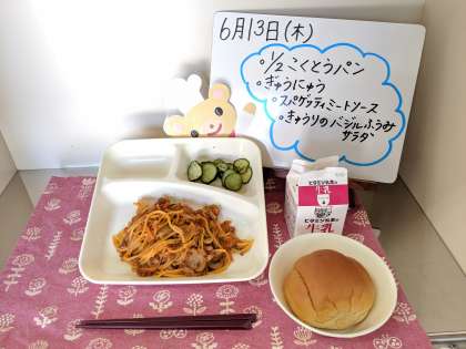 今日の給食は、1/2黒糖パン、牛乳、スパゲッティミートソース、きゅうりのバジル風味サラダです。
