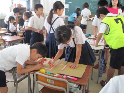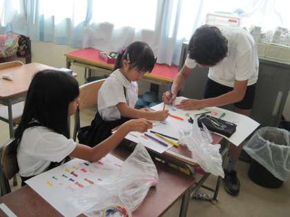 高学年児童が低学年児童にやさしく声をかけながら、お店づくりを進めていきました。