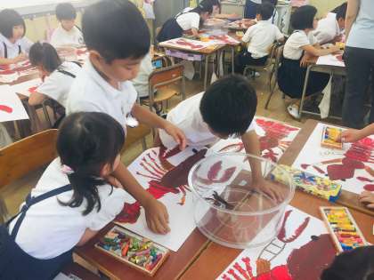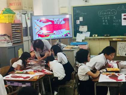 学級で育てているザリガニの絵をかきました。子どもたちは、ザリガニをよく見ながら、かいていました。