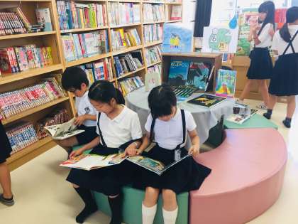 図書委員の児童が「図書館開放へ来てください。」と呼びかけをしていました。