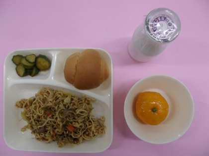 今日の献立は「焼きそば、きゅうりのピリ辛あえ、みかん(冷凍)」でした。