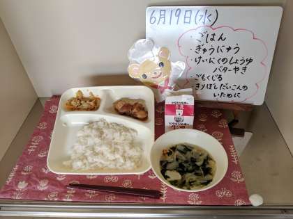 今日の給食は、ごはん、牛乳、鶏肉のしょうゆバター焼き、五目汁、切干しだいこんのいため煮です。