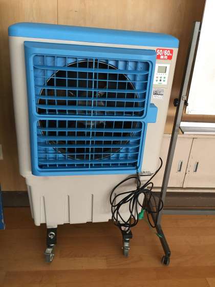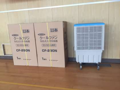 熱中症予防対策として、冷風機をPTAから2台設置していただいていました。今日は三軒家東社会福祉協議会から2台設置していただき、合わせて4台を設置しています。