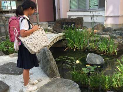 今日は、ハスが開花しました。児童が嬉しそうに見ていました。