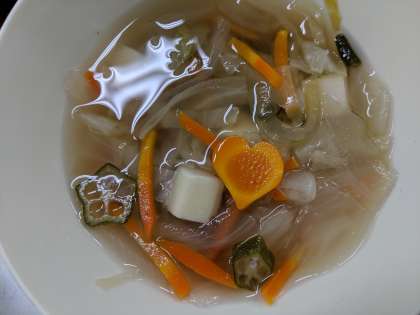 すまし汁には、ハート型のラッキーにんじんが入っていました。ラッキーにんじんが当たった児童は、うれしそうにしていました。